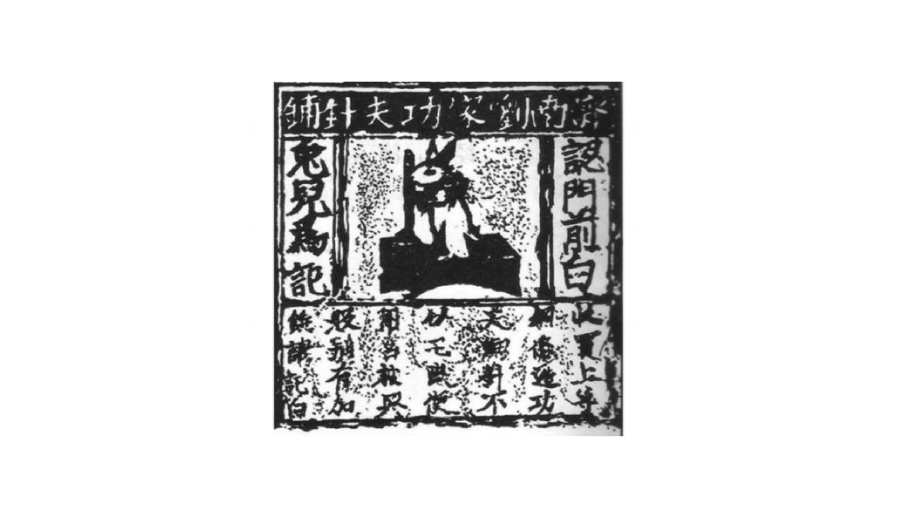 這是中國現(xiàn)存最早的一份印刷廣告,是宋代劉家功夫針鋪廣告,同時也是一張包裝紙, 銅版正中偏上刻著一只拿著鐵杵搗藥的白兔,白兔四周刻著密密麻麻的小字:上方為“濟(jì)南劉家功夫針鋪”;左右為“認(rèn)門前白兔兒為記”;下方為“收買上等鋼條,造功夫細(xì)針。不誤宅院使用,轉(zhuǎn)賣興販,別有加饒,謂記白”。文字皆為反刻,由此推測這塊銅版應(yīng)是用來印刷廣告的。它是集包裝紙、傳單、廣告三位與一體的設(shè)計形式,具有濃厚的商業(yè)色彩。