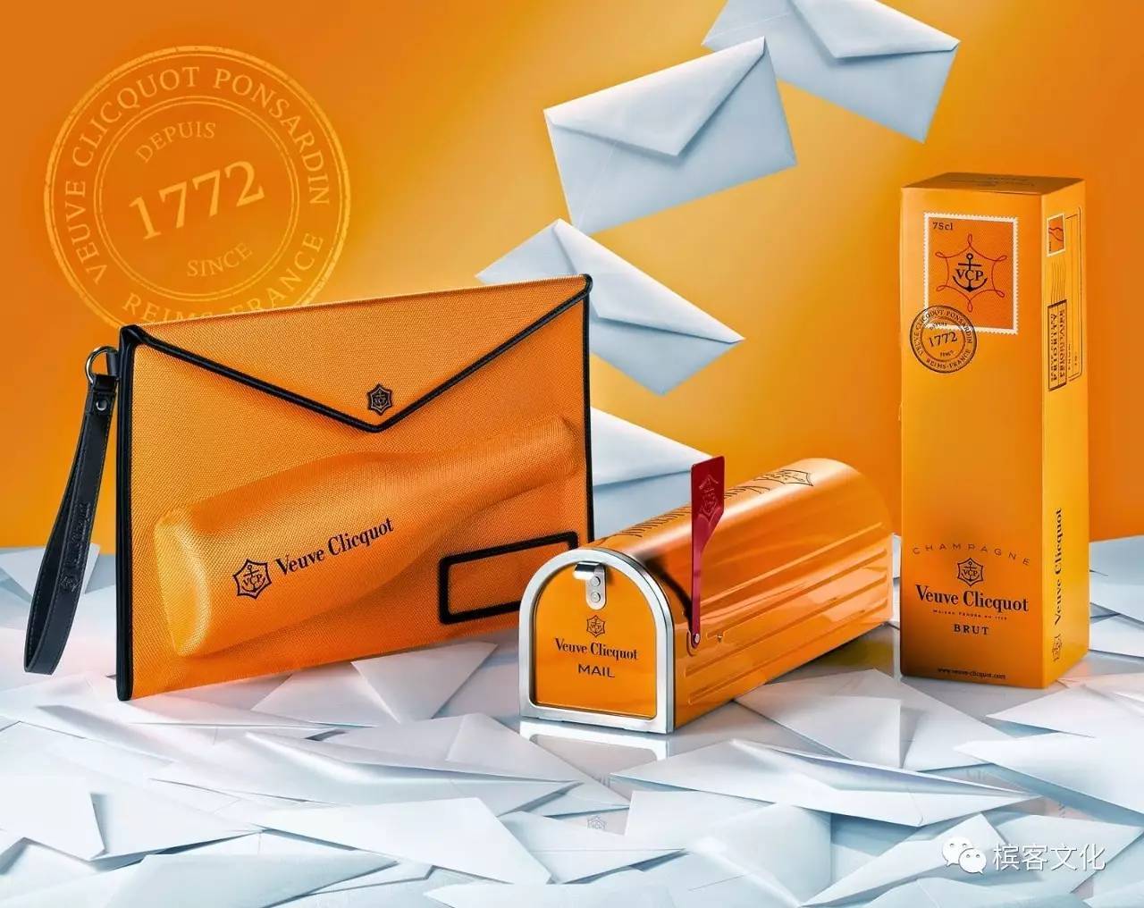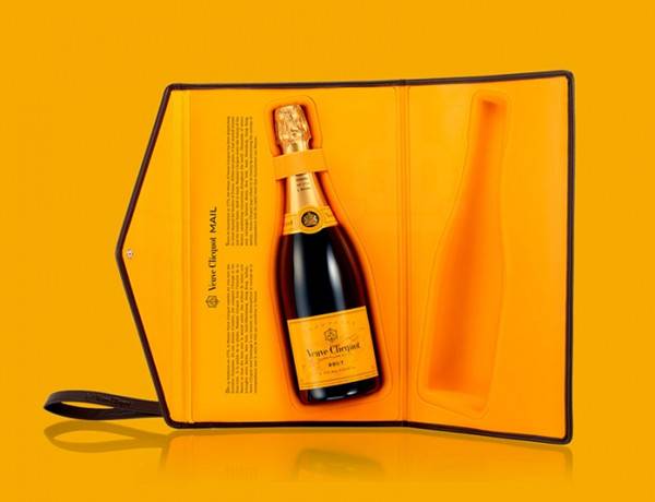 這是凱歌香檳經(jīng)典的信封手提包設(shè)計,醒目的橙黃色為主色調(diào),大面積的使用讓該包裝能夠在第一時間抓住人的視線。包裝的邊緣是棕色的,還有一條棕色的腕帶,讓整體包裝色調(diào)變得豐富、有層次起來,包上還有一條棕色的腕帶。腕帶的設(shè)計是為了方便進行攜帶,這樣客戶在趕路的時候就可以很容易地把它帶在身邊了。